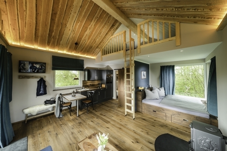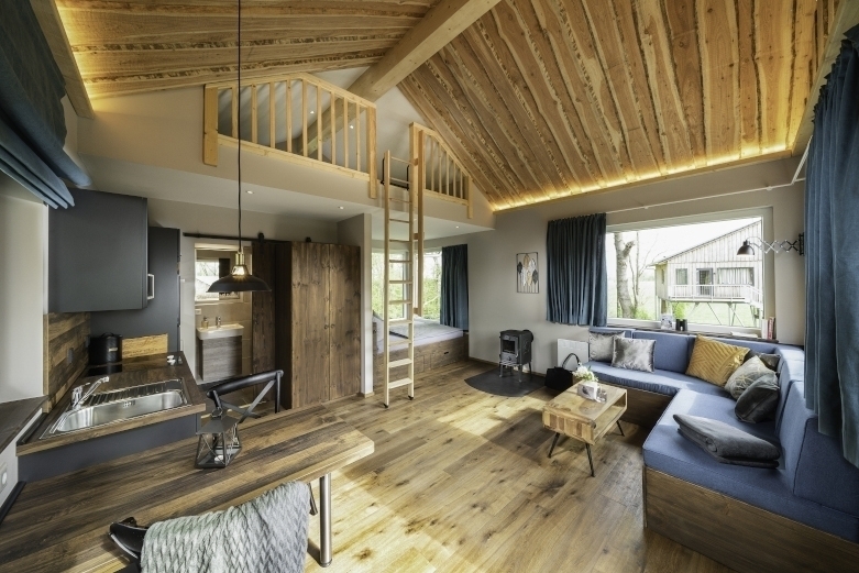 In unserem Haus „Star“ in vier Meter Höhe befindet sich ein Doppelbett, ein Wohnbereich mit Ecksofa und Kaminofen, ein Bad mit Toilette, Dusche und Waschtisch, eine Pantry-Küche mit Herd, Backofen, Geschirrspülmaschine, Esstisch und Bistro-Stühlen. Es gibt einen Fernseher und Wlan.